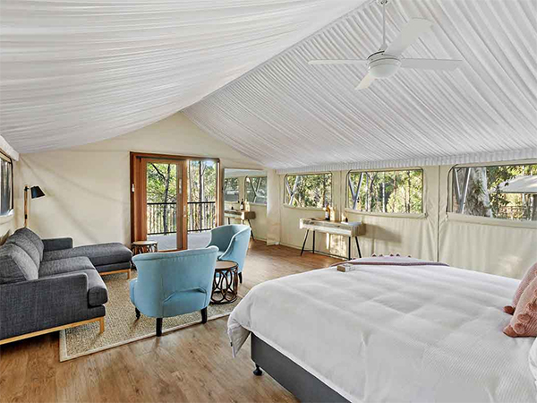 Located just 30 minutes from Brisbane at Mount Cotton, Sanctuary at Sirromet is a glampsite of 18 tents set up among the vines of this family-owned winery. In addition to luxe appointments – king-size bed, en suite, air-conditioning, locally sourced breakfast hamper – there’s TV-free solitude, stunning landscapes, lots of wildlife and a well-stocked cellar door just five minutes’ walk away.