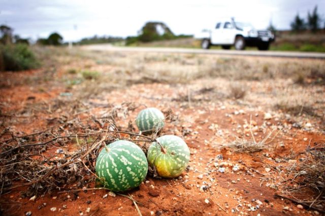 It is the little things that catch our eye along this stretch of the highway up to Ouyen, where we plan to spend the night. Good rains have brought an abundance of wild melons. Bright green and yellow, they litter the countryside along the road, creating a striking contrast against the brown earthy tones of the surrounding farmland. We find miniature wagons for sale in Manangatang, homemade mailboxes made from milk cans and scrap metal, as well as little help-yourself stalls where you can buy butternut pumpkins in exchange for leaving change.
