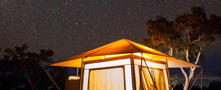 Probably our pick of the Kimberley glamping spots, no one we know has ever regretted staying at Kooljaman. Owned and run by the local Indigenous community, the Bardi Jawi, the whole experience is so infused with local culture that it leaves all guests truly transformed. Right on the beach at Cape Leveque, 210 kilometres and about six hours’ drive north of Broome, the glamping accommodation comes in two different levels: basic glamping, which is comfortable camping with single beds or more safari-style luxury tents.