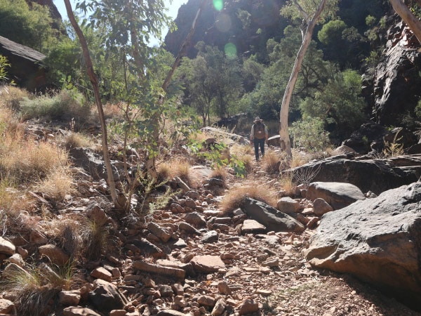 I’m completely surrounded by sheer red and purple quartzite rock faces and ghost gums looking as if they’ve been caught exposed, their bare white trunks glowing for all to see. The ground is coated in deceptively downy-looking spinifex but I carefully step in Filippo’s footsteps underneath an impossibly blue sky. So far today i’ve seen only two other humans.