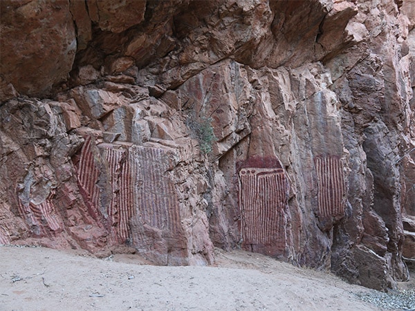 Vivid lines of ochre mark the walls of this open-air gallery, in the spot where Intwailuka, an ancestral hero, is said to have cooked and eaten caterpillars on his Dreamtime journey.