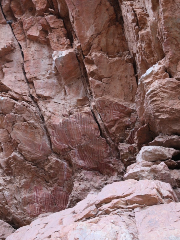 A short walk takes us into the narrow gorge where 6000 individual petroglyphs, or rock carvings – some as old as 10,000 years – decorate the red rock walls. This is the story of the Caterpillar Dreaming, with intricate circles and lines showing caterpillars transforming to butterflies. Many were done by pecking: holding a sharp stone against the rock and striking it with another, heavier stone.