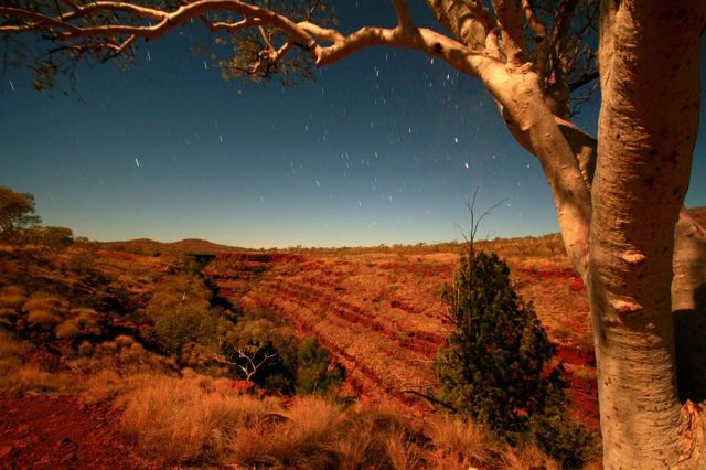 We trek the four-kilometre return trip of Dales Gorge, the most Grand Canyon-esque of Karijini’s gorges, beginning at one sublime swimming hole, the emerald-coloured Fern Pool, and ending at Circular Pool, enclosed by a high rim of dark rock. In between, the creek bed is full of sunken gardens, shallow waterfalls and stacks of striped rock. In places the gorge walls rise up sheer, in others they are worn into chunky steps, climbing to the canyon rim.